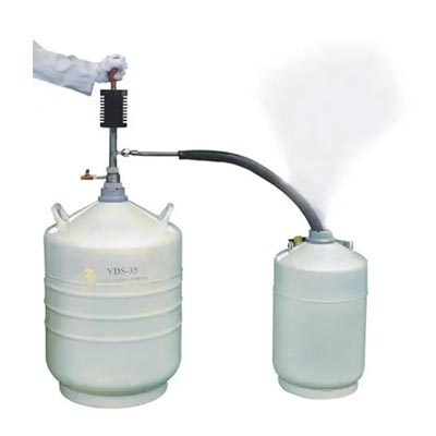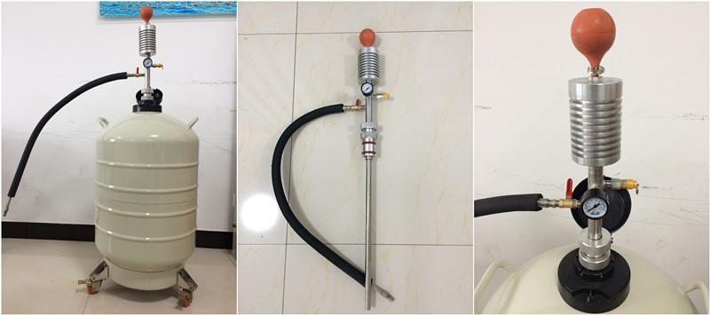 該產(chǎn)品依靠操作者手捏吸液球(ZYB-5型),使液氮容器內(nèi)貯存的液氮少量產(chǎn)生氣化。由于液氮的氣液體積比較大,氣化后的氮?dú)庠诿芊獾娜萜鲀?nèi)對盛裝的液氮增壓,促使容器內(nèi)盛裝的液氮排放出來,達(dá)到對其它容器補(bǔ)充液氮的目的。它具有操作方便可靠、排液過程中液氮的蒸發(fā)損失低的優(yōu)點(diǎn)。